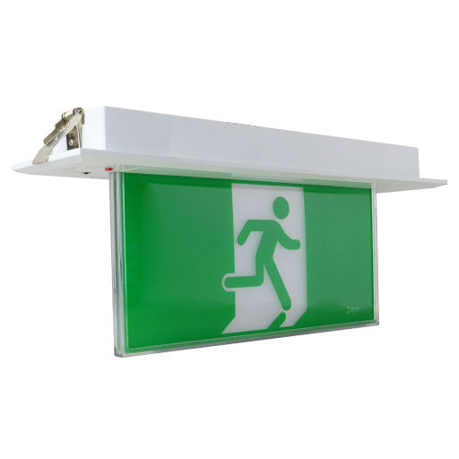 Universal LED escape sign luminaire, for recessed ceiling mounting. Slim blade for enhanced design aesthetics. Maintained operation. With reliable lithium iron phosphate battery. Manual test switch. Supplied with a pictogram set to allow escape route identification to be determined at installation, for both single and double sided installations. Suitable for 24m viewing distance (AS/NZS 2293). Polycarbonate body and diffuser in white finish. Simple installation with flex & plug. Low 3W standby power.