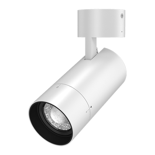 An LED spotlight with the built in ability to adjust its zoom from a spot distribution to a wide flood distribution.Class I electrical, IP20. A die-cast aluminium body and ceiling mounted cable enclosure in a matte white. The Sirio spot surface mounted version maintains its ability to rotate through 350° and tilted up to 90°. Colour rendering Ra >90 and changeable vario colour temperature switch allowing the CCT choice of 3000K, 4000K and 5500K.
