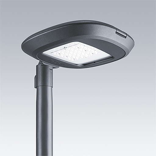 A highly versatile LED lantern with a Narrow Road, asymmetric distribution. Electronic, fixed output control gear driving 24 LEDs at 1.05A. Compatible with PL, LRT, 7 pin Nema socket. Class II electrical (this product is not earthed), IP66, IK10. Housing, canopy and spigot: die-cast aluminium (EN AC-47100) powder coated anthracite (close to RAL7043).. Enclosure: 6mm thick clear glass.. Complete with 4000K LED. Post top mounting to Ø60mm column, tilt 5°, adjustable from 0° to +10°.