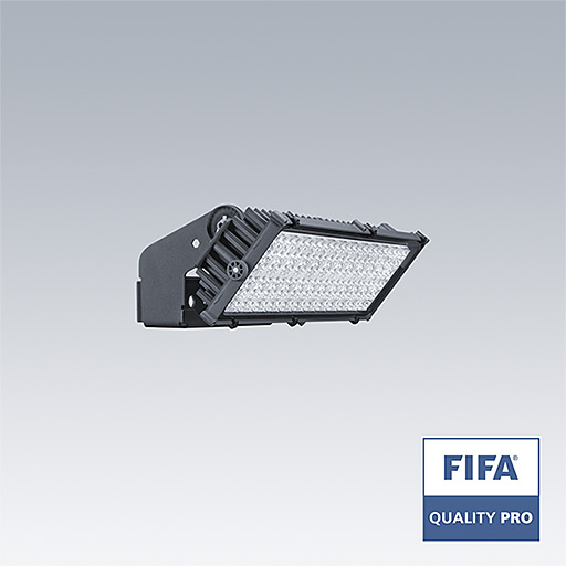 Projecteur LED haute puissance avec distribution lumineuse Optique 1 : asymétrique 60°; de 144 LED. Appareillage externe, Fourni uniquement par Thorn Lighting, à commander séparément (courant de transmission maximum 1400mA) et câblage via câble de type H07 RN-F et mini-diamètre de 13 mm. Classe électrique I, IP66, IK08. Dissipateur thermique : Moulage sous pression aluminium thermopoudré gris foncé (similaire à RAL 7043). Support de fixation et cadre : gris foncé (similaire à RAL 7043). Fermeture : 4 mm transparent verre. Fourche montée à l’aide des points de fixation disponibles (une vis M20 et deux vis M14). Fonctionnement à faibles papillotements (< 1 %) adapté à une diffusion TV haute définition. Livré avec LED 4 000 K