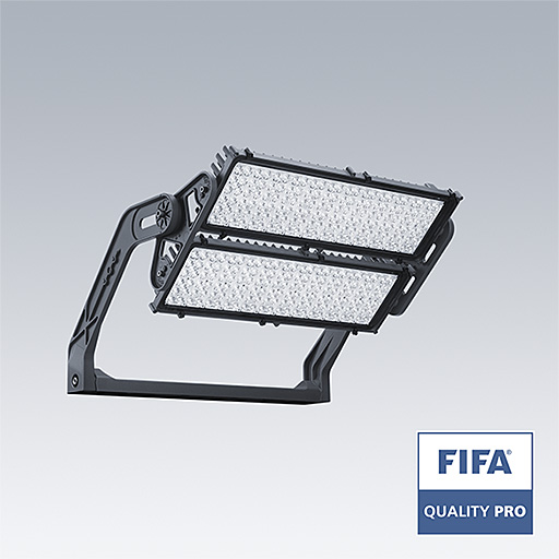 Projecteur LED haute puissance avec distribution lumineuse Optique 1 : faisceau étroit; Optique 2 : asymétrique 60°; de 312 LED. Appareillage externe, Fourni uniquement par Thorn Lighting, à commander séparément (courant de transmission maximum 850mA) et câblage via câble de type H07 RN-F et mini-diamètre de 13 mm. Classe électrique I, IP66, IK08. Dissipateur thermique : Moulage sous pression aluminium thermopoudré gris foncé (similaire à RAL 7043). Support de fixation et cadre : gris foncé (similaire à RAL 7043). Fermeture : 4 mm transparent verre. Fourche montée à l’aide des points de fixation disponibles (une vis M20 et deux vis M14). Fonctionnement à faibles papillotements (< 1 %) adapté à une diffusion TV haute définition. Livré avec LED 4 000 K