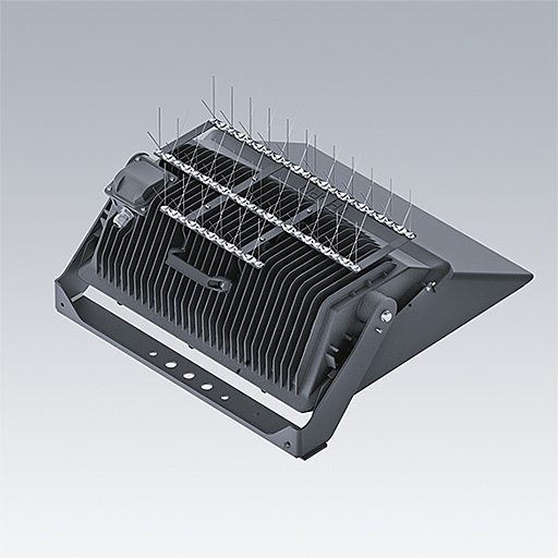Il s’agit d’un support recouvert de pointes, qui est installé au-dessus d’un projecteur pour empêcher que les oiseaux ne se perchent. Leurs excréments pourraient endommager la peinture et, dans le cas des environnements côtiers, créer de la corrosion. Cet accessoire est obligatoire dans les environnements côtiers.