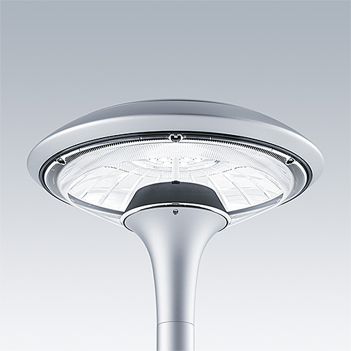 Plurio Direct : Lanterne LED décorative à montage top avec distribution Radialement symétrique. Driver avec 18 LED entraînés à 700mA. Classe électrique II, IP66, IK08. Base : coulé aluminium, thermopoudré gris argent. Chapeau : forme disque, aluminium, texturé gris argent. Diffuseur : anti-UV, transparent Polycarbonate (PC) avec prismes anti-éblouissement. Optique à lentille direct avec réflecteur interne Equipé d'un 50% circuit de réduction de puissance, qui entre en vigueur 3 heures avant et 5 heures après un minuit calculé. Il peut être désactivé à l'installation avec un interrupteur interne facilement accessible. Livré avec LED 4 000 K. Montage top sur mât de Ø 60mm.