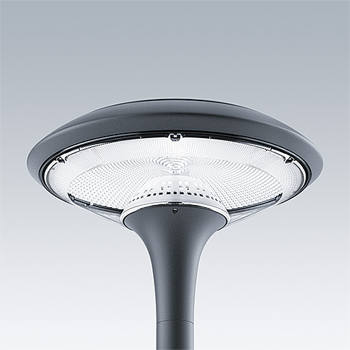 Plurio Indirect : Lanterne LED décorative à montage top avec distribution Radialement symétrique. Driver avec 24 LED entraînés à 500mA. Classe électrique II, IP66, IK08. Base : coulé aluminium, thermopoudré gris anthracite 900 sablé. Chapeau : forme disque, aluminium, texturé gris anthracite 900 sablé. Diffuseur : anti-UV, transparent Polycarbonate (PC) avec prismes anti-éblouissement. Optique à réflecteur indirect Equipé d'un 50% circuit de réduction de puissance, qui entre en vigueur 3 heures avant et 5 heures après un minuit calculé. Il peut être désactivé à l'installation avec un interrupteur interne facilement accessible. Livré avec LED 4 000 K. Montage top sur mât de Ø 60mm.