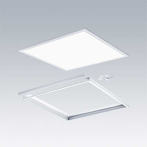 Luminaire LED encastré/plafonnier/suspension. Driver, gradable DALI-2. Classe électrique II, IP20, Résistance aux impacts : IK03. Corps : tôle d'acier, blanc (similaire à RAL9016). Diffuseur : Polycarbonate (PC) anti-UV. Optique microprismatique pour un espacement maximisé. Connexion électrique via borniers à poussoirs, avec repiquage possible.