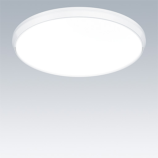 Luminaire circulaire décoratif avec corps Large. Composant indirect bas pour éclairage du mur et du plafond. Electronique, non gradable. Garniture esthétique du luminaire en Polycarbonate (PC) blanc. Diffuseur : opale Polycarbonate (PC). Classe électrique II, IP54. Livré avec LED 4 000 K.