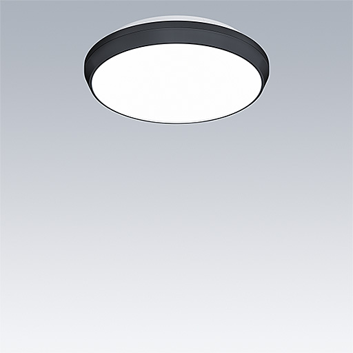 Luminaire circulaire décoratif avec corps Small. Composant indirect bas pour éclairage du mur et du plafond. Electronique, non gradable. Garniture esthétique du luminaire en Polycarbonate (PC) noir. Diffuseur : opale Polycarbonate (PC). Classe électrique II, IP54. Livré avec LED 4 000 K.