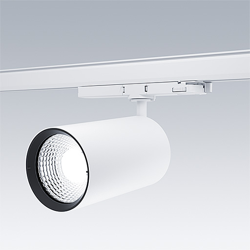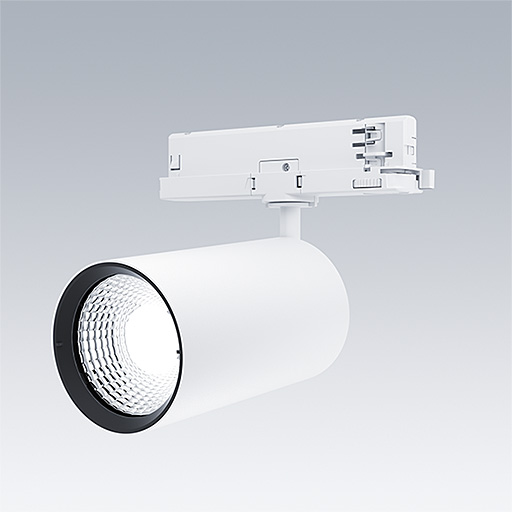 Projecteur LED pour installation sur rail triphasé avec distribution lumineuse de type spot et température de couleur stabilisée. Electronique, non gradable. Classe électrique II, IP20. Corps : aluminium Moulage sous pression, peinture microtexturée blanc. Réflecteur : PC poudré. Projecteur orientable sur le plan horizontal de 360° et inclinable sur le plan vertical de 90°. Livré avec LED 3 000 K