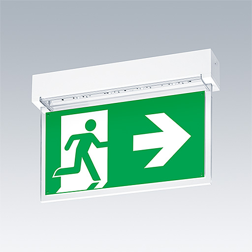 Luminaire de secours à LED Slim IP65 pour un montage apparent, au mur ou au plafond ; avec adaptateur à clipser pour un montage apparent au mur fourni, montage encastré au plafond possible avec cadre d'encastrement en option ; Luminaire pour alimentation centralisée de l'éclairage de sécurité avec surveillance du circuit électrique sans surveillance individuelle du luminaire ; Le modèle High performance (HP) permet l'agrandissement de la distance entre luminaires ainsi que des applications avec des éclairements plus élevés (p. ex. 5 lux, 1 footcandle) ; ; ; ; Longueur du câble entre la source de l’alimentation de sécurité et le dernier luminaire : max. 300 m ; avec optique à clipser optimisée en option pour les voies d'évacuation et les zones ouvertes à partir de hauteurs de montage plus élevées ; informations à clipser pour une vision à une distance maximale de 23 m et de 30 m permettant une transformation en un luminaire à pictogramme ; boîtier en polycarbonate blanc ; vasque en polycarbonate transparent ; montage sans outils par simple « clic » après la mise en place de la base du boîtier ; bornier à montage rapide, câblage traversant possible jusqu'à 2,5 mm² ; aucun entretien grâce à la technologie LED ; durée de vie de 50 000 h à flux lumineux constant ; alimentation électrique : 220/240 V AC ; Puissance du luminaire: 5,6 W ; degré de protection : IP65, classe de protection : SC2 ; résistance aux impacts : IK03 ; Dimensions : 336 x 54 x 59 mm ; poids : 0,6 kg